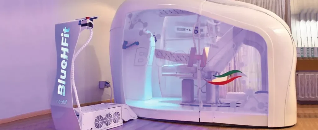 Con BlueHfit, l’ospite viene accomodato su un lettino motorizzato all’interno di una capsula a temperatura controllata e, irradiato da una fonte led blu, mentre effettua un’attività fisica aerobica mediante una pedalata a resistenza controllata.